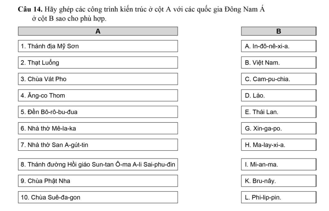 Từ kiến thức đã được học và hiểu biết của bản thân, ta có thể ghép các công trình kiến trúc ở cột A với các địa điểm thuộc quốc gia Đông Nam Á ở cột B như sau: