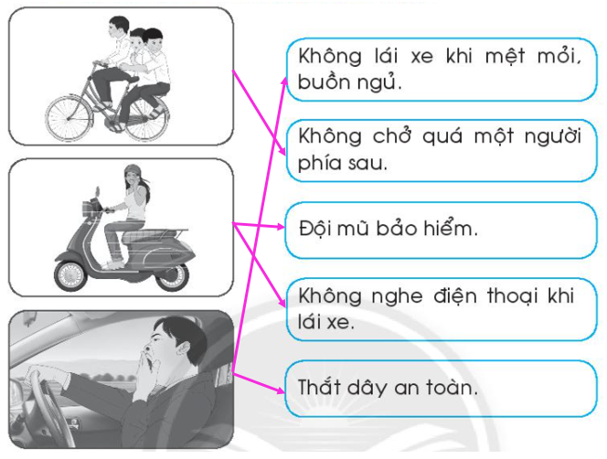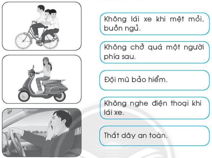 Xếp các biển báo giao thông dưới đây vào cột phù hợp và viết tên gọi của biển báo đó theo bảng bên dưới. Đánh dấu tích vào ô trống ở hình chỉ hành vi đúng. Em sẽ khuyên gì cho các nhân vật trong mỗi hình sau. Nối mỗi hình vẽ với lời khuyên phù hợp. Hình nào vẽ bạn Nam đội mũ bảo hiểm đúng cách và an toàn. Vì sao. Quan sát các hình gợi ý để giải ô chữ.