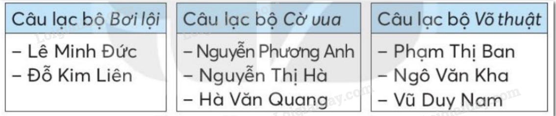 – Câu lạc bộ Võ thuật có 3 bạn đăng kí là: Phạm Thị Ban, Ngô Văn Kha, Vũ Duy Nam.