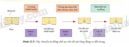 Chỉ ra vai trò của robot trong dây chuyền sản xuất tự động chế tạo chi tiết pít tông động cơ đốt trong ở hình 12.5?