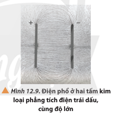 Quan sát Hình 12.9, vẽ đường sức điện trường trong vùng không gian giữa hai tấm kim loại phẳng.