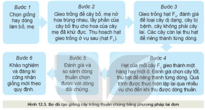 Quan sát Hình 12.3 và mô tả các bước trong quy trình chọn tạo giống cây trồng thuần chủng bằng phương pháp lai đơn.