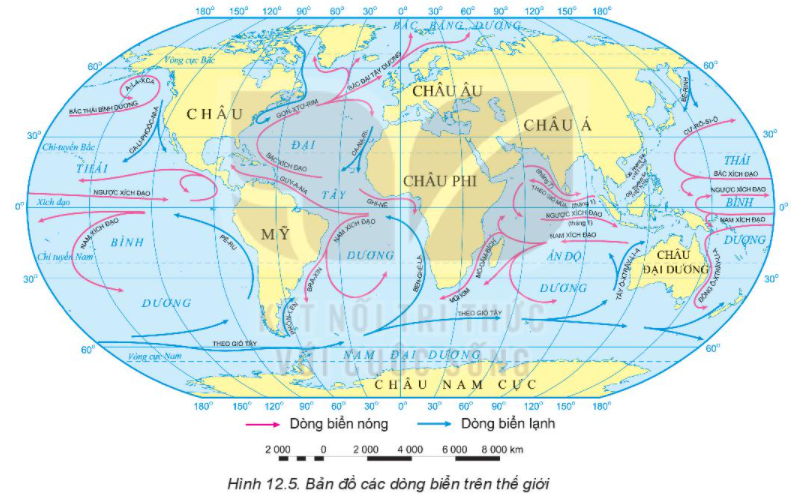 Đọc thông tin trong mục c(Dòng biển) và quan sát hình 12.5 (Chú ý dòng biển nóng được kí hiệu bằng đường mũi tên màu đỏ, dòng biển lạnh được kí hiệu bằng đường mũi tên màu xanh).