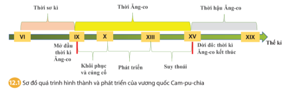Dựa vào sơ đồ 12.1 và thông tin trong bài, em hãy tóm tắt lại quá trình hình thành và phát triển của vương quốc Cam-pu-chia.