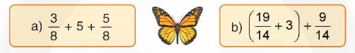 b) $\left( {\frac{{19}}{{14}} + 3} \right) + \frac{9}{{14}} = \left( {\frac{{19}}{{14}} + \frac{9}{{14}}} \right) + 3 = \frac{{28}}{{14}} + 3 = 2 + 3 = 5$