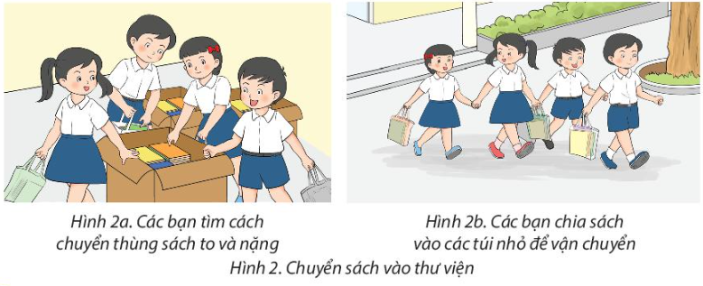 – Ở Hình 2, các bạn nhỏ được giao nhiệm vụ chuyển một số thùng sách to và nặng vào thư viện trường. Em hãy cho biết các bạn làm thế nào để có thể dễ dàng thực hiện được công việc này?
