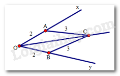 Cho \(\widehat {xOy} = {50^0}\), vẽ cung tròn tâm O bán kính bằng 2cm, cung tròn này cắt Ox, Oy lần lượt ở A và B. Vẽ các cung tròn tâm A và tâm B có bán kính 3cm, chúng cắt nhau tại điểm C nằm trong góc xOy. Tính \(\widehat {xOC}\) .