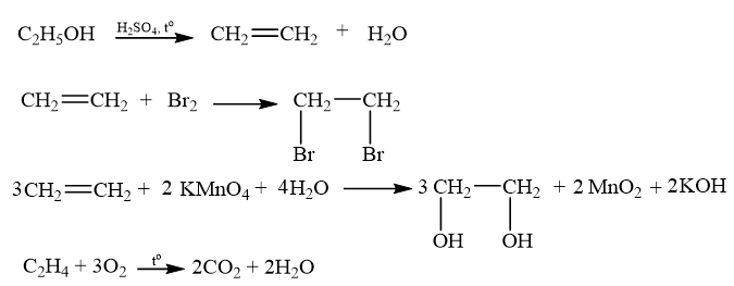 – Giải thích hiện tượng: Khí ethylene sinh ra từ phản ứng tách nước ethanol (xúc tác sulfuric acid đặc), ethylene phản ứng với dung dịch bromine và dung dịch thuốc tím, làm mất màu hai dung dịch trên. Khi đốt cháy khí ethylene, phản ứng tỏa ra nhiều nhiệt.
