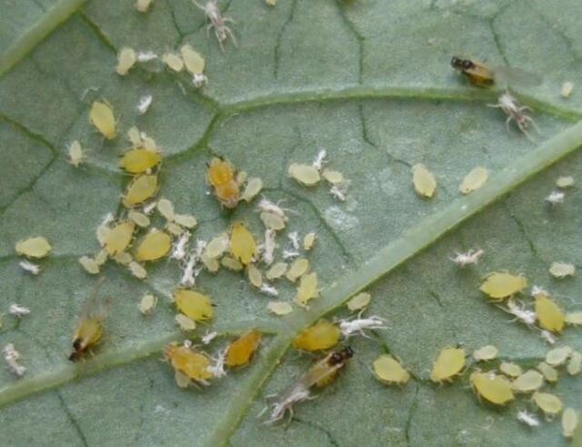 – Rệp rá: Rệp lá có kích thước nhỏ, cánh có hình hạt vừng và miệng được cấu tạo để hút nước, chất dinh dưỡng từ thực vật. Rệp lá sinh trưởng và phát triển nhanh nhất vào mùa xuân. Chúng phá hoại hầu hết các loại cây cảnh, rau củ mềm như đậu, dưa chuột, cà chua, cải bắp,…