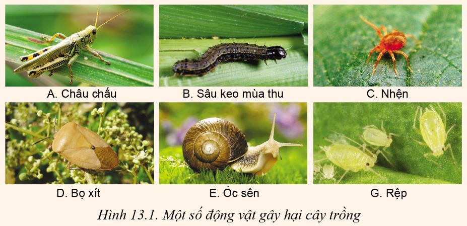 Quan sát các hình ảnh dưới đây và cho biết đâu là côn trùng hại cây trồng? Vì sao? Quan sát Hình 13.2 và nghiên cứu nội dung mục 2.1, mô tả đặc điểm hình thái và tập tính sinh học của sâu cuốn lá nhỏ hại lúa.