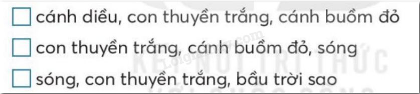 Những từ ngữ chỉ sự vật trong bài đọc là: giấy trắng, bút màu, bầu trời sao, ông trăng, ngõ, cánh diều, gió, trời xanh, biển cả, con thuyền, cánh buồm, sóng, ông mặt trời, chùm phượng, sân trường, ve.