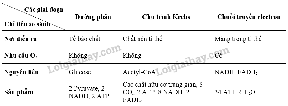 Ba giai đoạn chính của phân giải hiếu khí trong tế bào và đặc trưng của mỗi giai đoạn là: