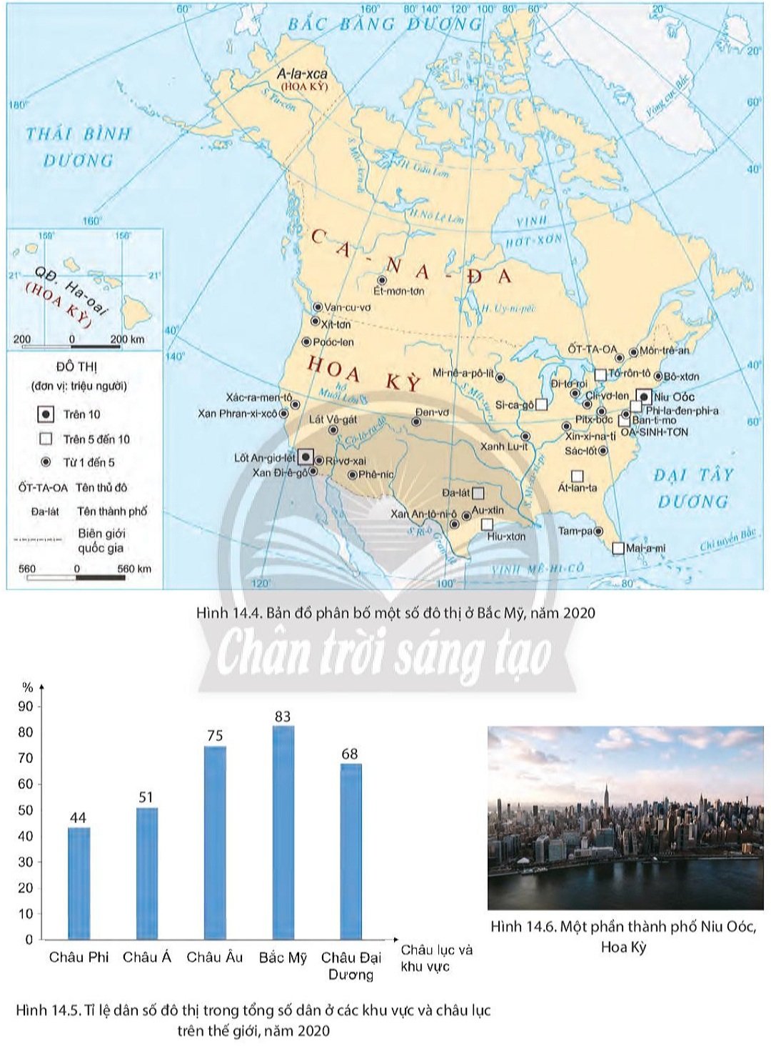Dựa vào hình 14.4, 14.5, 14.6 và thông tin trong bài, em hãy phân tích vấn đề đô thị hóa ở Bắc Mỹ.