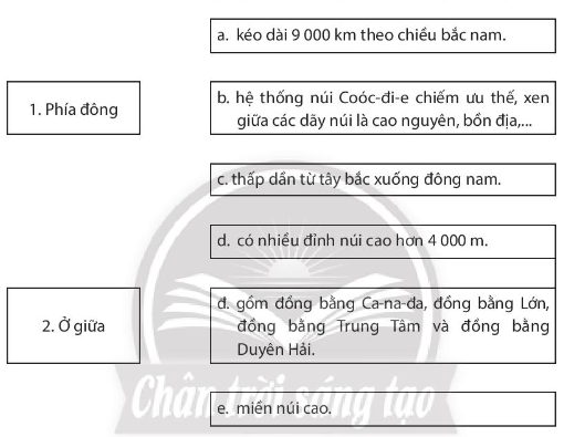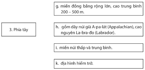 Hãy nối các ý 1, 2, 3 (ở các ô bên trái) với các ý a, b, c, d, đ, e, g, h, i, k (ở các ô bên phải) để thể hiện sự phân hóa địa hình khu vực Bắc Mỹ.