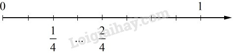 Ta thấy: từ vạch \(\displaystyle0\) đến vạch \(\displaystyle1\) được chia thành \(\displaystyle8\) phần bằng nhau. Ta có thể quy đồng hai phân số \(\displaystyle \dfrac {1}{4}\) và \(\displaystyle \frac {2}{4}\) với mẫu số chung là \(\displaystyle8\) rồi tìm phân số ở giữa hai phân số đó.