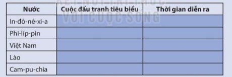 1. Hãy lập và hoàn thành bảng thống kê (theo gợi ý dưới đây) về một số cuộcđấu tranh tiêu biểu của nhân dân Đông Nam Á chống chủ nghĩa thực dân.
