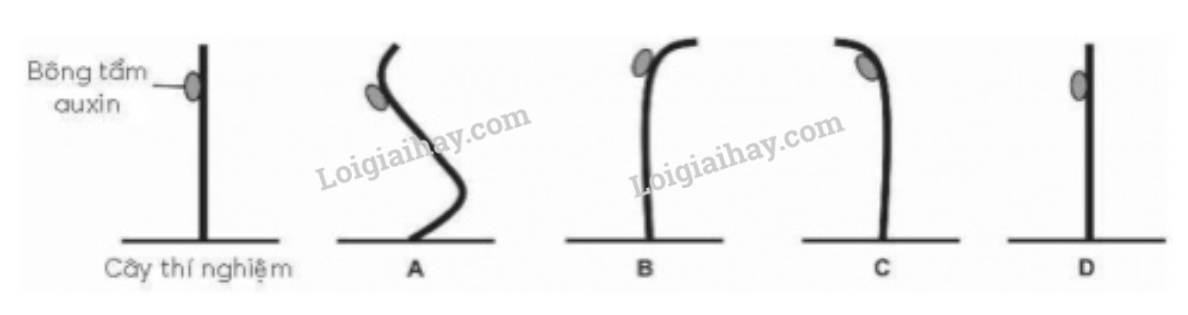 Dùng bông tẩm auxin rồi áp sát vào một bên thân ở phần ngọn cây đã cắt đỉnh sinh trưởng (như hình vẽ sau). Sau 10 ngày, kết quả thu được theo hình nào trong các hình sau?