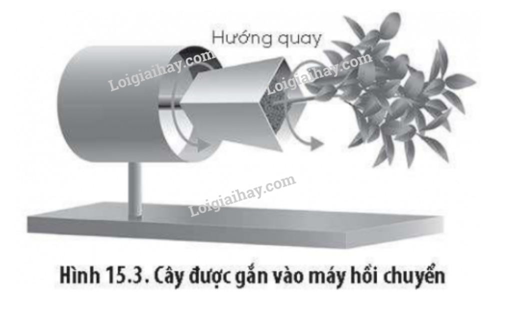 Một nhà thực vật học đã đặt cây nằm ngang trên máy hồi chuyển (Hình 15.3). Em hãy dự đoán phản ứng của thân và rễ cây đối với trọng lực sẽ như thế nào. Giải thích.