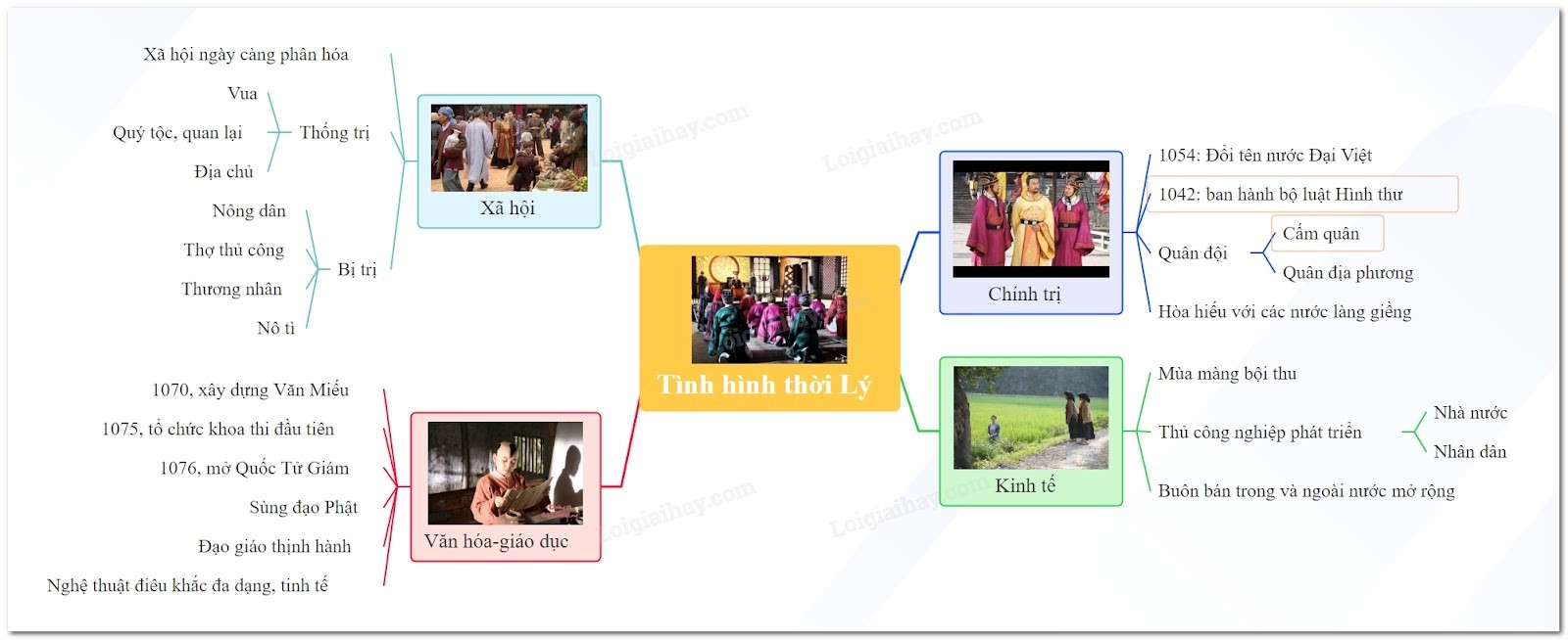 1. Từ thông tin bài học, hãy vẽ sơ đồ tư duy thể hiện những nét chính về tình hình chính trị, kinh tế, xã hội và văn hóa, giáo dục thời Lý.