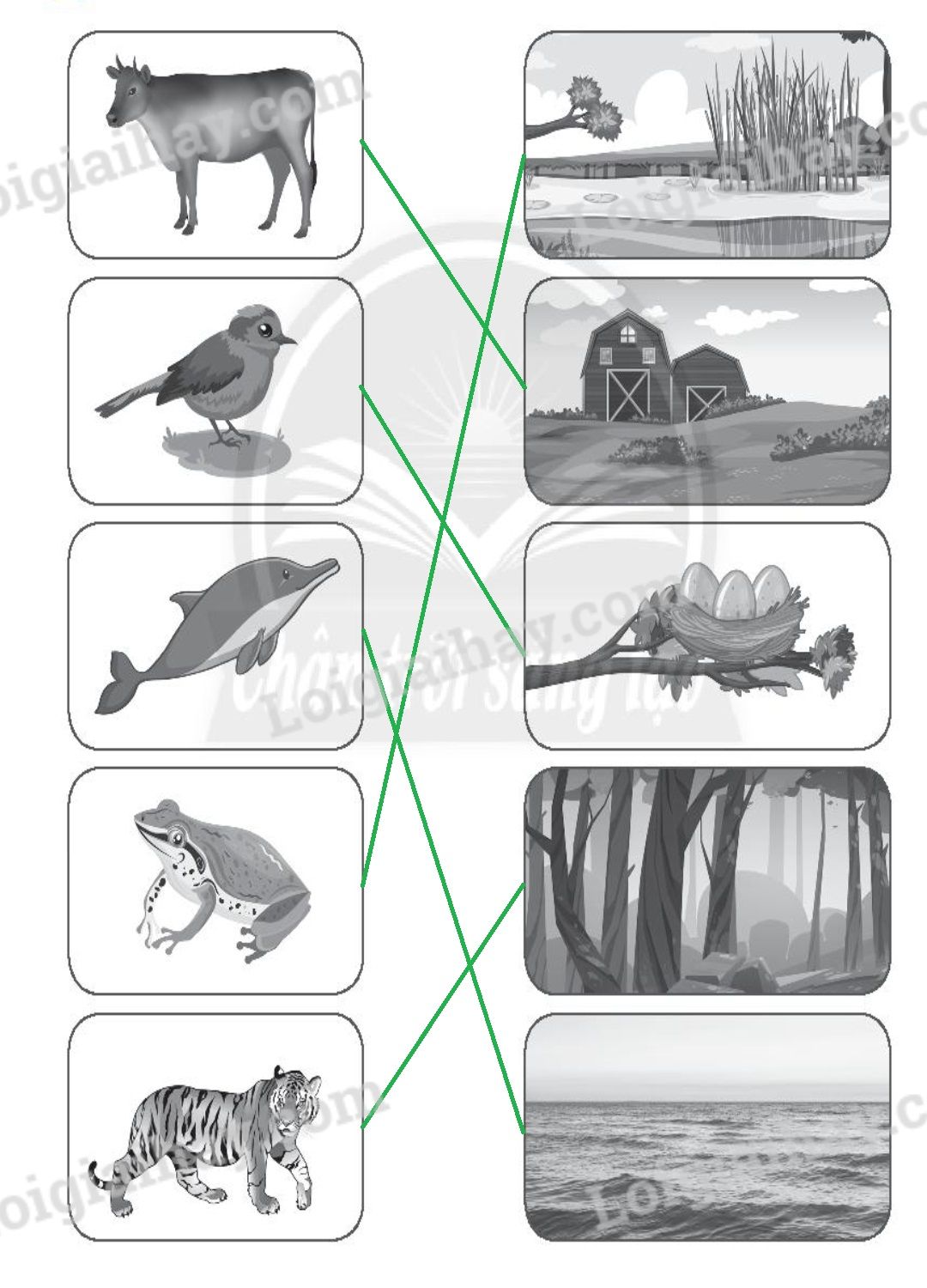 Nối hình con vật với nơi sống của chúng.