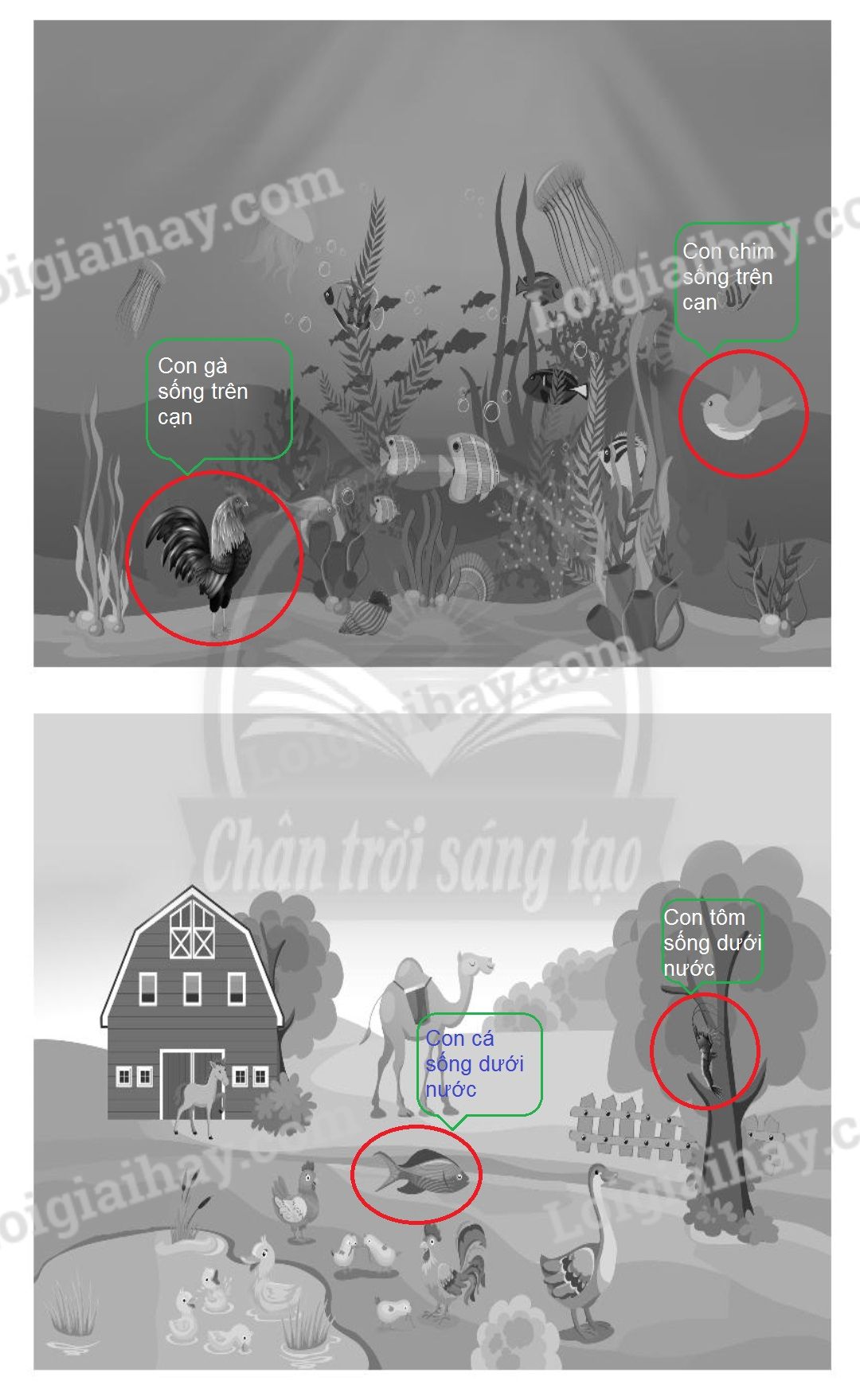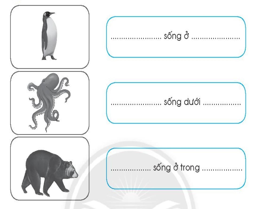 Nối hình con vật với nơi sống của chúng. Quan sát hình và điền từ thích hợp vào chỗ (…). Viết tên các con vật có trong hình vào nhóm thích hợp. Tìm và khoanh vào những điểm vẽ không đúng trong mỗi hình sau.