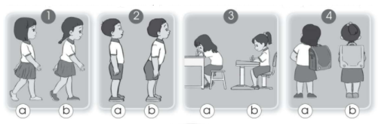 Viết nhận xét về tình trạng cột sống và vị trí hai vai của các bạn trong hình 1 và hình 2 vào chỗ … dưới đây cho phù hợp. Nối ô chữ mô tả tình trạng cột sống với hình cho phù hợp. Tô màu vào chữ cái dưới hình bạn đi, đứng, ngồi và đeo cặp sách không đúng,có thể dẫn đến cong vẹo cột sống. Tự đánh giá việc thực hiện đi, đứng, ngồi học và đeo cặp sách đúng cách của em bằng cách đánh dấu x vào ô tương ứng trong bảng dưới đây. Em cần thay đổi thói quen nào khi nào thực hiện đi, đứng, ngồi và đeo