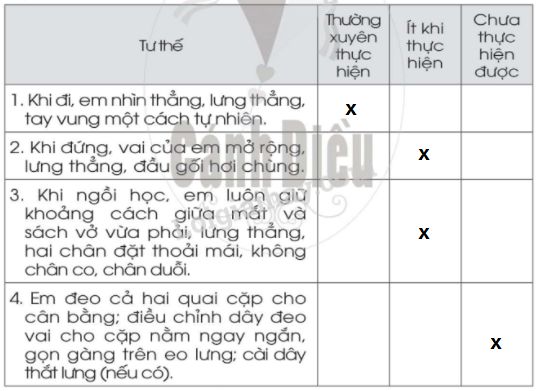 Tự đánh giá việc thực hiện đi, đứng, ngồi học và đeo cặp sách đúng cách của em bằng cách đánh dấu x vào ô tương ứng trong bảng dưới đây.