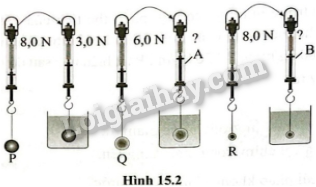 Một bạn học sinh thực hiện thí nghiệm lần lượt treo các vật P, Q, R vào lực kế và nhúng vào trong cùng một chất lỏng (hình 15.2). Tuy nhiên, bạn đó đã quên một vài giá trị đo được của lực kế. Biết rằng thể tích của vật P bằng thể tích của vật Q và gấp hai lần thể tích của vật R (VP = VQ = 2VR ). Hãy xác định:
