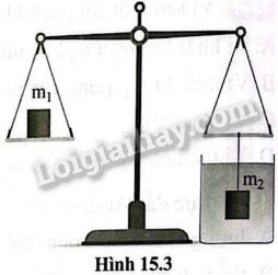 Có hai vật có khối lượng m1 và m2. Vật m1 được đặt ở đĩa cân bên trái, vật m2 được treo vào đĩa cân bên phải. Lúc đầu, cân thăng bằng. Sau đó, người ta nhúng vật m2 ngập hoàn toàn trong chất lỏng (hình 15.3). Cân còn thăng bằng nữa hay không? Nếu không thăng bằng thì cân sẽ lệch về phía nào? Vì sao?