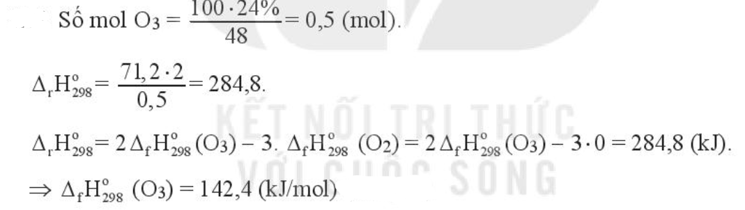Hỗn hợp thu được có chứa 24% ozone về khối lượng, tiêu tốn 71,2 kJ. Nhiệt tạo thành \({\Delta _f}H_{298}^o\) của ozone (kJ/mol) có giá trị là