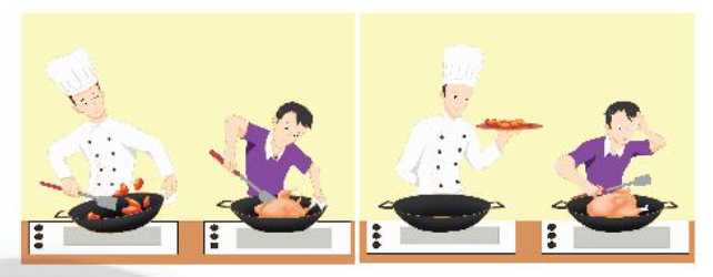 Bài 1: Hai nhân vật minh họa trong hình bên đang chế biến món gà rán, được thực hiện bằng hai cách. Một người chọn cách chia ra từng phần nhỏ, người còn lại chọn cách để nguyên, giả thiết các điều kiện đều giống nhau (nhiệt độ, lượng dầu ăn,…) Hãy cho biết cách nào món ăn nhanh chín hơn? Giải thích