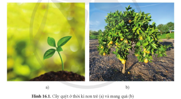 Quan sát hình 16.1, cho biết cây quýt thời kì non trẻ khác gì so với cây quýt trưởng thành. Hãy cho biết thực vật lớn lên như thế nào?