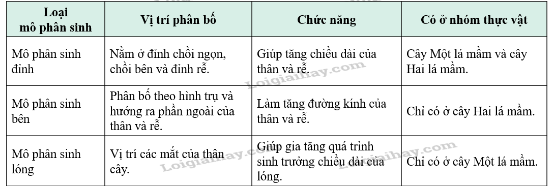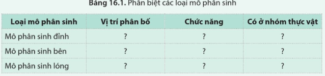 LT: Phân biệt các loại mô phân sinh theo gợi ý trong bảng 16.1.