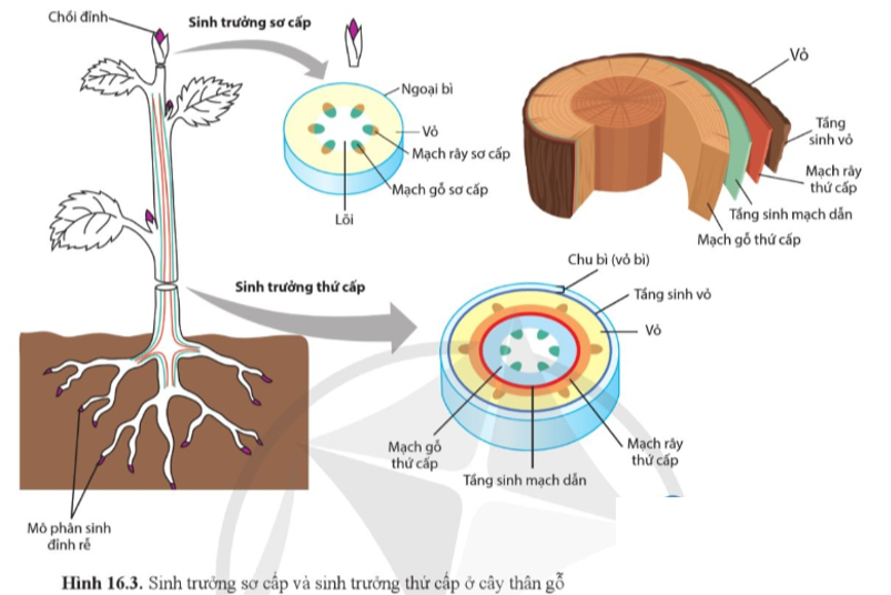 CH: Quan sát hình 16.3, xác định vị trí diễn ra sinh trưởng sơ cấp và sinh trưởng thứ cấp ở cây thân gỗ.