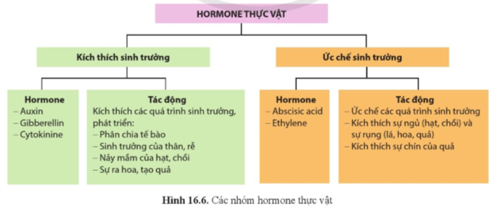 CH 2: Quan sát hình 16.6 và cho viết hormone thực vật gồm những nhóm nào. Sự phân chia các nhóm hormone này dựa trên căn cứ nào?