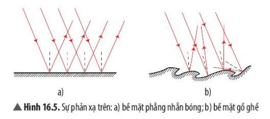 Hình 16.5b, các tia sáng phản xạ hướng về nhiều phía khác nhau.
