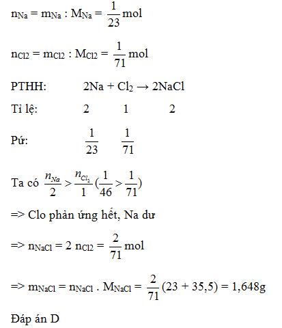 Dựa vào phương trình so sánh xem Na ; Cl2 chất nào phản ứng hết, chất nào dư. Mọi tính toán theo số mol của chất phản ứng hết.