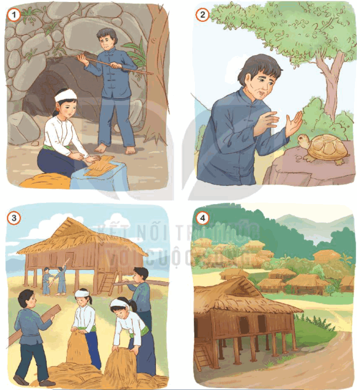– Tranh 4: Kể từ đó, người dân có nhà sàn để ở, tránh được mưa nắng.