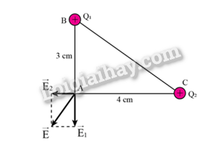 Cho tam giác ABC vuông tại A có AB = 3 cm và AC =4 cm. Tại B ta đặt điện tích \({Q_1} = 4,{5.10^{ – 8}}\), tại C, ta đặt điện tích \({Q_2} = {2.10^{ – 8}}\)C. Hãy tính độ lớn của cường độ điện trường do hai điện tích này gây ra tại A.