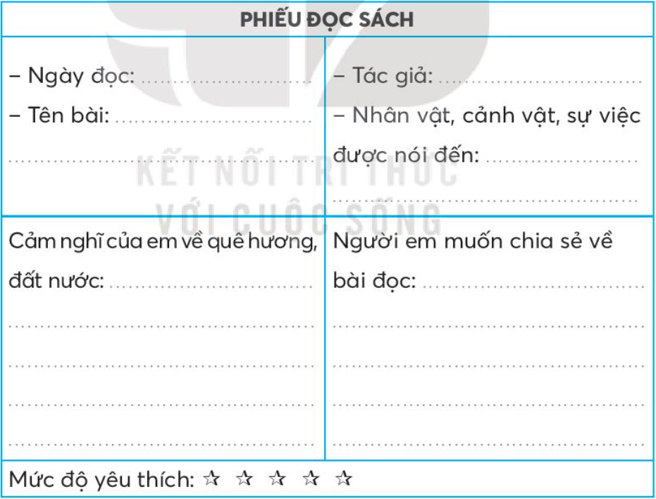 Đọc bài Cửa Tùng hoặc tìm đọc câu chuyện, bài văn, bài thơ,… về quê hương, đất nước và viết thông tin vào phiếu đọc sách.