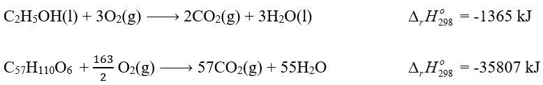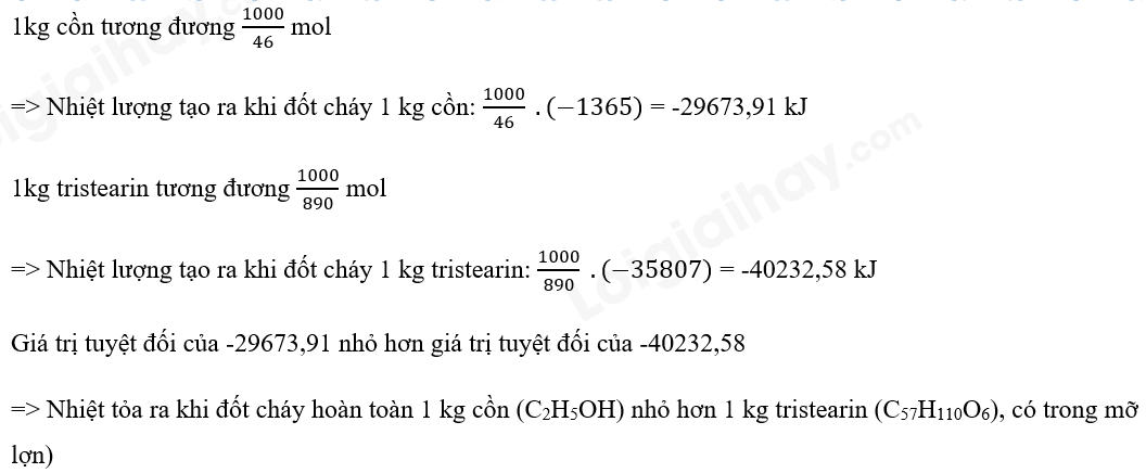 Câu 6. So sánh nhiệt tỏa ra khi đốt cháy hoàn toàn 1 kg cồn (C2H5OH) và 1 kg tristearin (C57H110O6), có trong mỡ lợn). Cho biết: