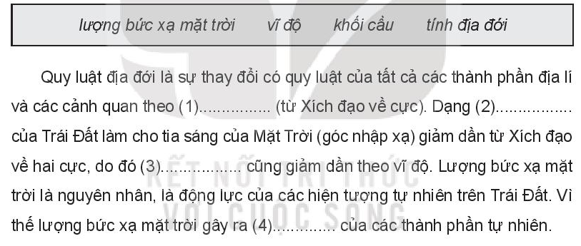 Dựa vào kiến thức đã học về nguyên nhân và  biểu hiện của quy luật địa đới trong các thành phần của địa quyển để chứng minh