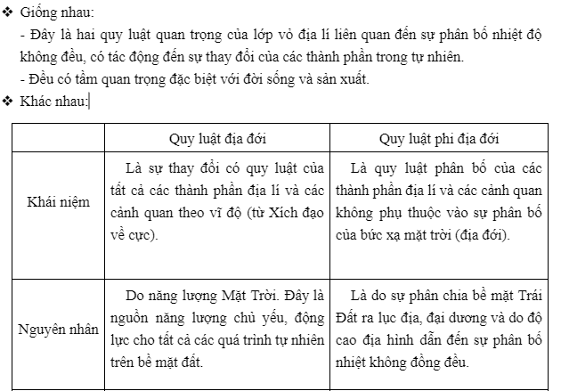 Dựa vào kiến thức đã học về quy luật địa đới và quy luật phi địa đới (chú ý đến khái niệm, nguyên nhân, biểu hiện, ý nghĩa của 2 quy luật này để so sánh).