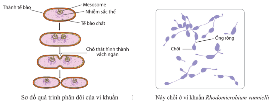 – Ở vi khuẩn, tế bào nhân đôi chất di truyền và biến đổi màng tế bào phát triển về một phía thành ống rỗng. Một phần tế bào chất và chất di truyền chuyển dịch vào cuối ống rỗng, ỗng rỗng phình to hình thành chồi và tách thành tế bào con.