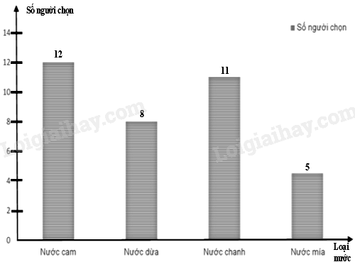 Biểu đồ cột biểu diễn số học sinh chọn các loại nước trong buổi liên hoan để uống gồm: nước cam, nước dừa, nước chanh, nước mía, mỗi học sinh đều đã uống đúng một loại nước: