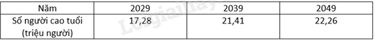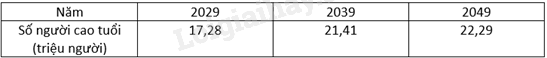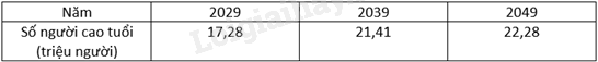 Các bảng thống kê ở các đáp án dưới đây đều thể hiện dự báo về số người cao tuổi đến năm 2049. Bảng thống kê ở đáp án nào có số người cao tuổi vào năm 2049 là 22,29 triệu người?