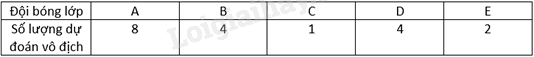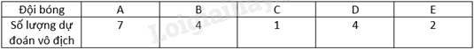 Khối 8 tổ chức giải bóng đá với 5 đội bóng tham dự là các đội bóng của các lớp A, B, C, D, E. Trước khi giải đấu diễn ra, Bắc đã thực hiện khảo sát dự đoán của các bạn về về độ bóng vô địch và thu được kết quả như sau: A, B, A, A, A, A, A, B, D, B, E, D, D, A, A, B, D, E, C. Bảng nào dưới đây thống kê đúng về số lượng dự đoán vô địch cho mỗi đội?