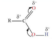 – Trong nhóm carboxyl, liên kết C=O phân cực, nguyên tử carbon mang một phần diện tích dương (δ+), khiến mật độ electron tại nhóm OH chuyển dịch về phía nhóm C=O, do đó liên kết C-OH phân cực mạnh, nhóm –OH dễ bị thay thế, nên carboxylic acid có thể tham gia phản ứng ester hoá.
