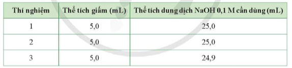 Giấm được sử dụng khá phổ biến để chế biến thức ăn. Bạn Mai muốn xác định nồng độ acetic acid có trong giấm bằng cách sử dụng dung dịch sodium hydroxide 0,1 M để chuẩn độ. Bạn lấy mẫu giấm ăn đó để làm thí nghiệm và kết quả chuẩn độ 3 lần như bảng sau: