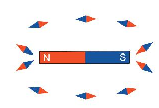 + Đặt kim nam châm tại các vị trí khác nhau xung quanh một nam châm như hình vẽ, kim nam châm nằm theo hướng khác nhau, vì khi đặt nam châm và kim nam châm khác cực thì chúng có xu hướng hút nhau, vì vậy nên chúng có các vị trí như hình vẽ.